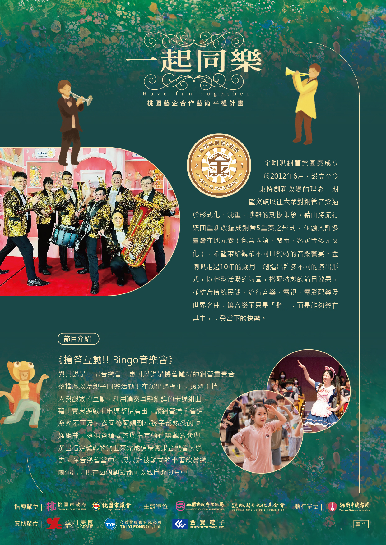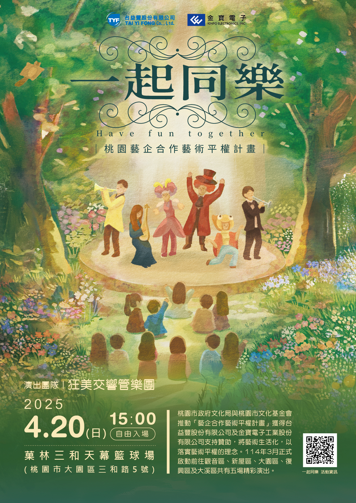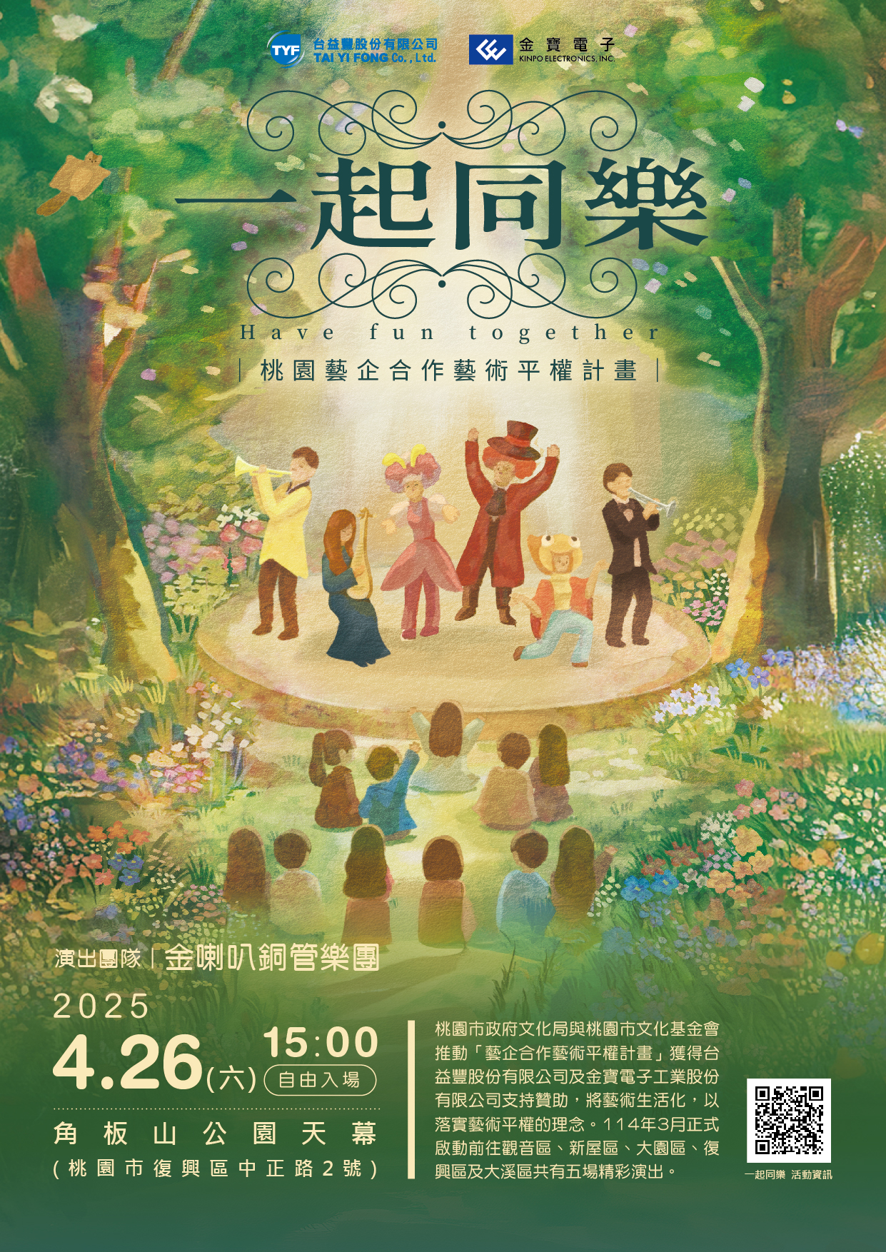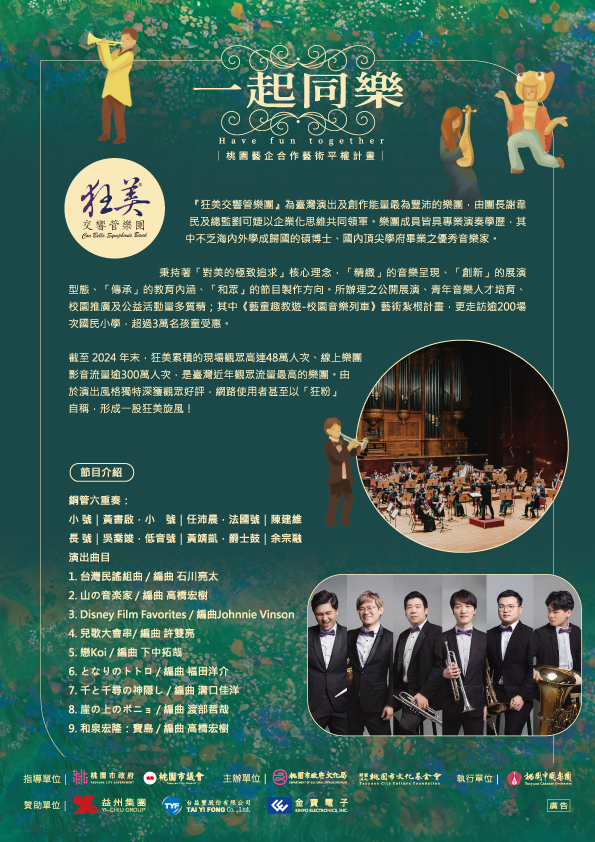 說明: 一、 本系列活動資訊如下: (一) 114年4月20日(星期日)下午3時,邀請「狂美交響管樂團」於大園區菓林三和天幕籃球場(桃園市大園區三和路5號)辦理演出。 (二) 114年4月26日(星期六)下午3時,邀請「金喇叭銅管樂團」於復興區角板山公園天幕廣場(桃園市復興區中正路2號)辦理演出。