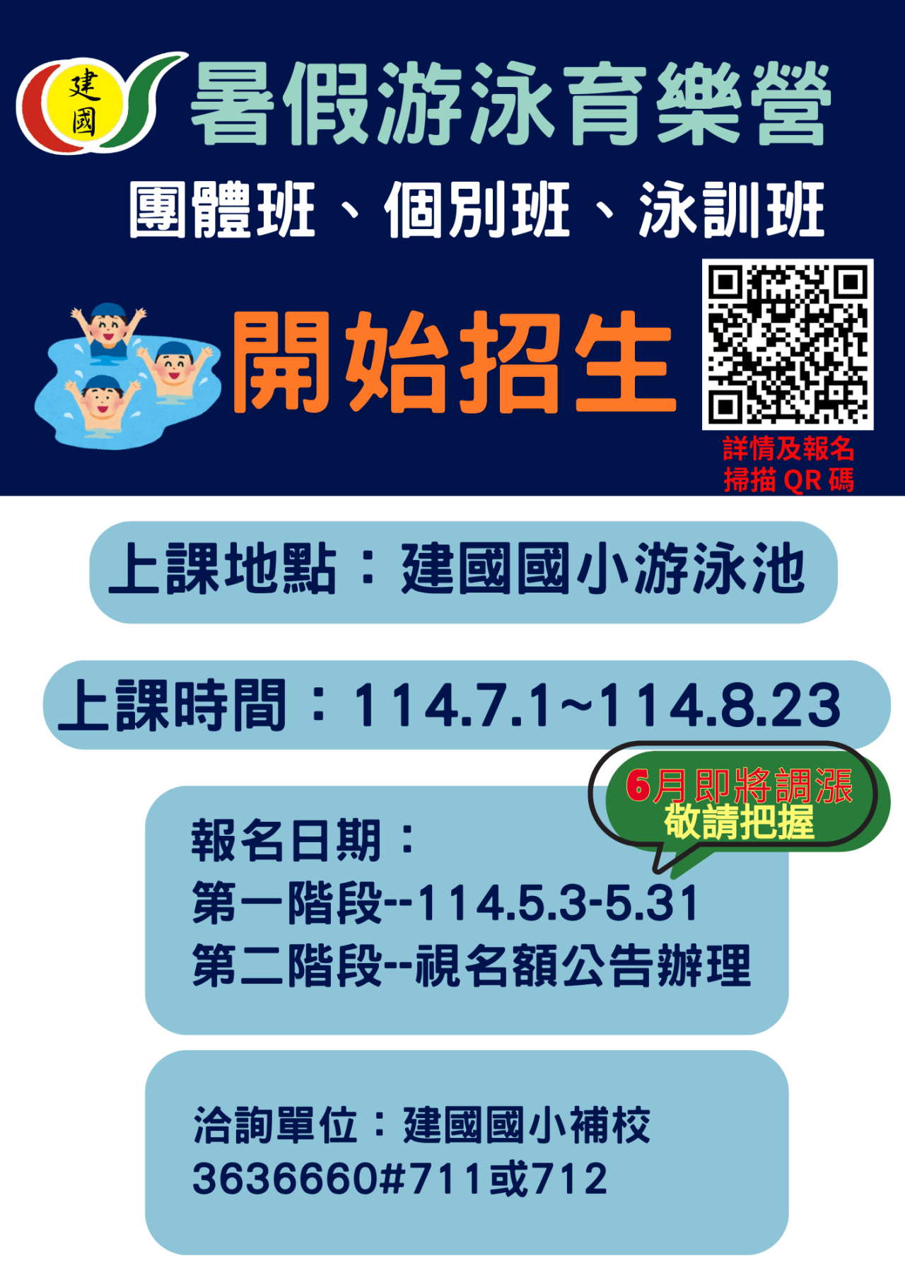 說明: 一、本校訂於114年7月1日起至8月23日辦理114年度暑假游泳育樂營,5月31日前報名享有優惠。 二、詳細報名資訊請參考簡章或 https://ecampus.com.tw/Index/AnnShow/54 ,如有疑問請洽3636660轉711或712。