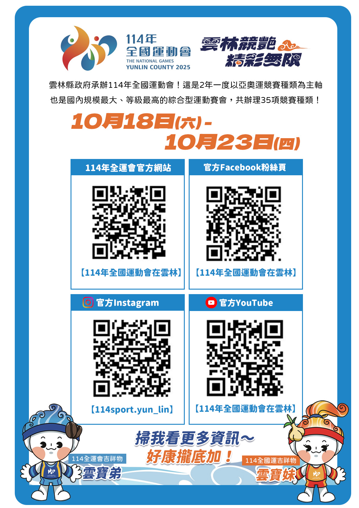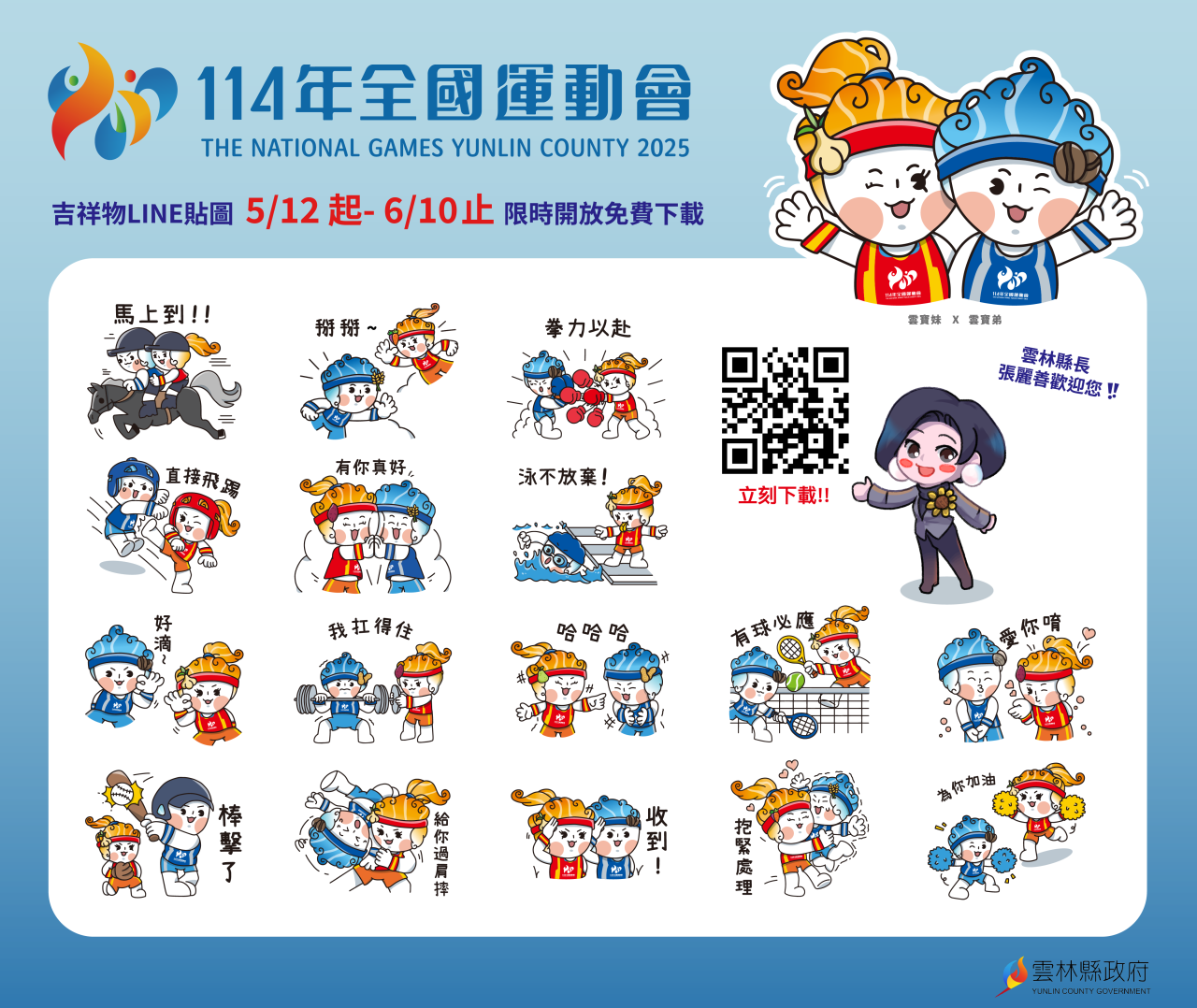 說明: 一、依據雲林縣政府114年5月14日府教體二字第1142426103號函辦理。 二、114年全國運動會LINE貼圖自114年5月12日(星期一)至6月10日止開放免費下載,貼圖下載連結如下: https://line.me/S/sticker/35159 ,共同為全國運動會增添熱度與關注。