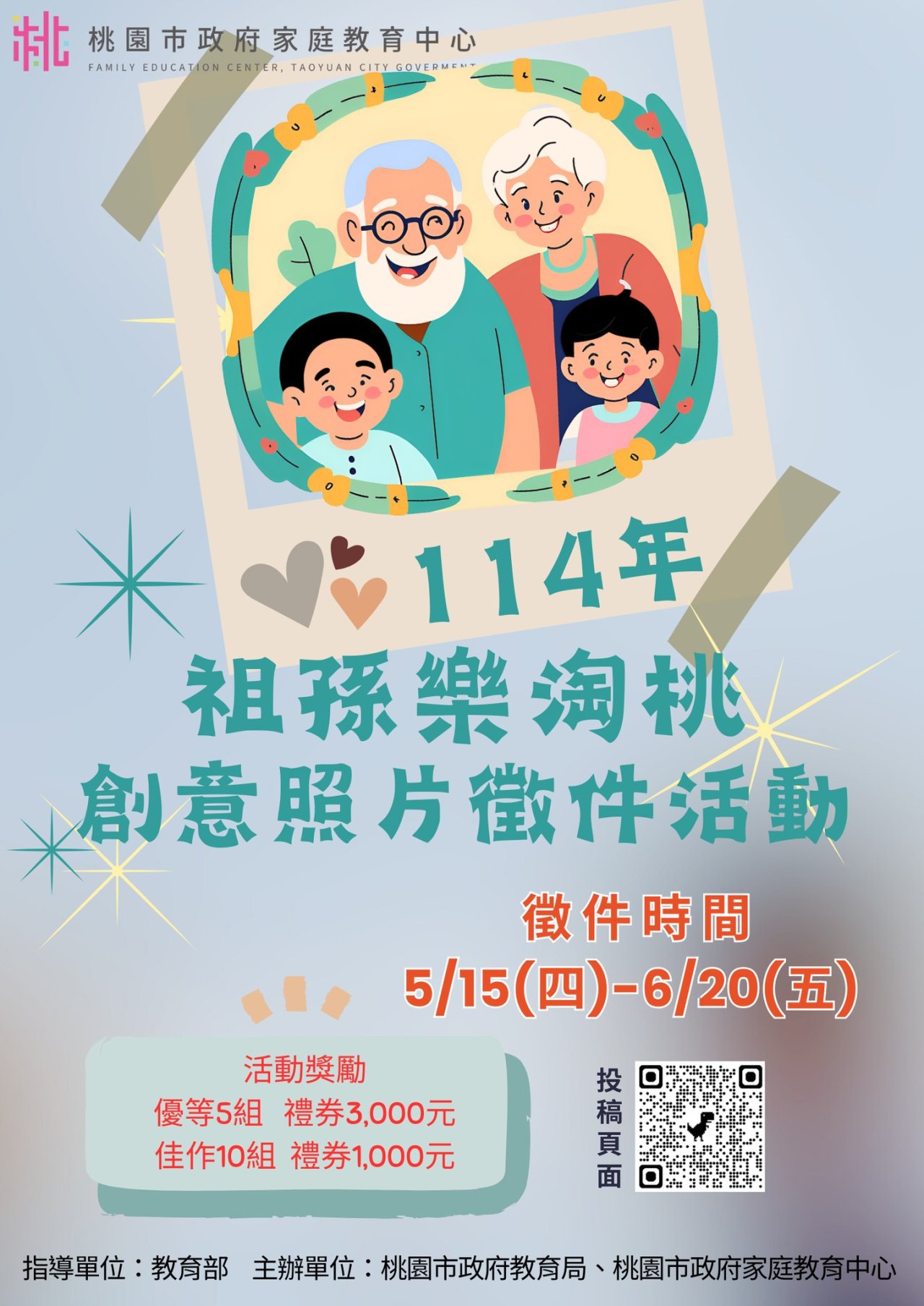 「祖孫樂淘桃創意照片徵件活動」係鼓勵民眾紀錄祖孫互動的溫馨時光,徵件期限至6月20日(星期五)止,惠請協助宣傳並鼓勵民眾參加,獎項及獎品如下: