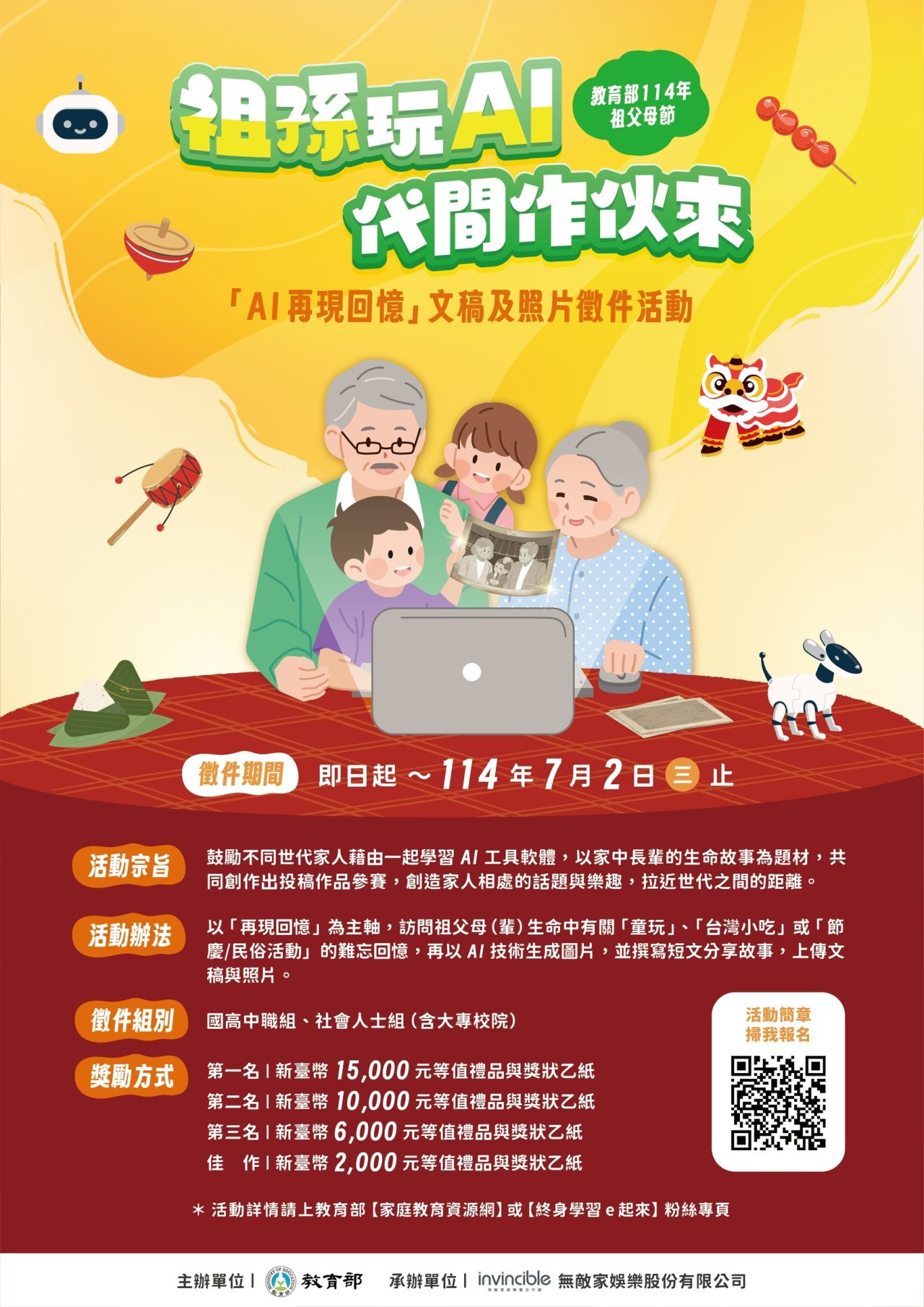 旨揭徵件組別分為「國中高中職組」及「社會人士組(含大專校院)」,共2組。參賽者須與不同世代家人組隊,以「再現回憶」為主軸,訪問祖父母(輩)生命中有關「童玩」、「台灣小吃」或「節慶/民俗活動」的難忘回憶,再以AI技術生成圖片,並撰寫短文分享故事,上傳文稿與照片。