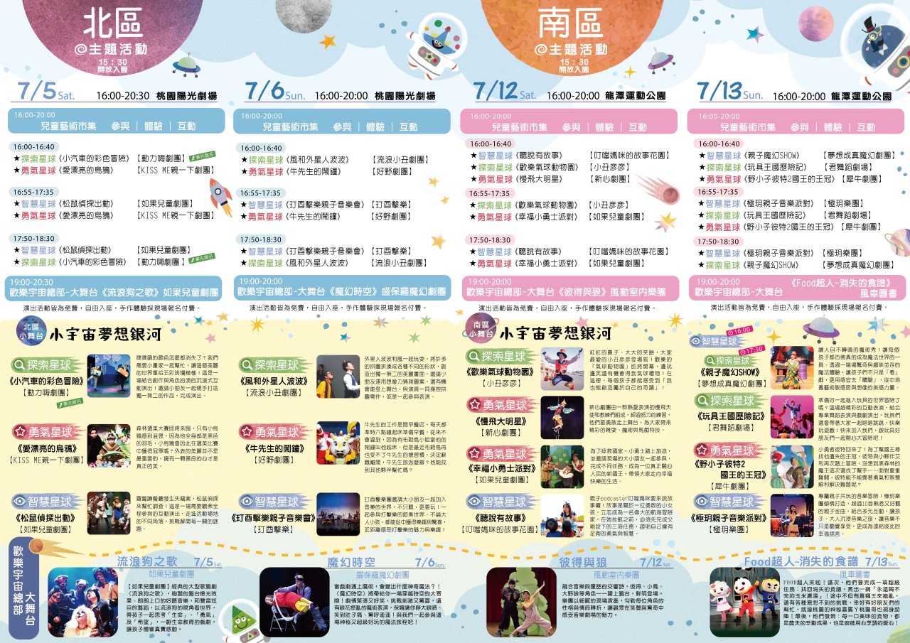 一、 本局為推廣兒童藝術啟蒙與在地藝文紮根,規劃辦理「2025 桃園兒童藝術節」,活動內容包含前導演出、兒童市集、小型表演 、主舞台大型演出,辦理時間及地點如下: