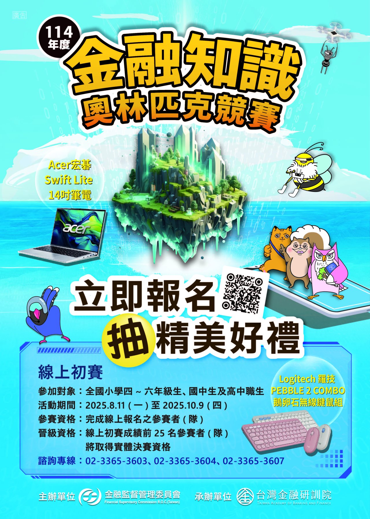1、參加對象:全國國中、高中職一至三年級學生。 2、線上初賽期間:114年8月11日至10月9日。 3、活動方式:分為國中個人組、國中團體組、高中 職個人組、高中職團體組,線上初賽後擇優進入 實體決賽。