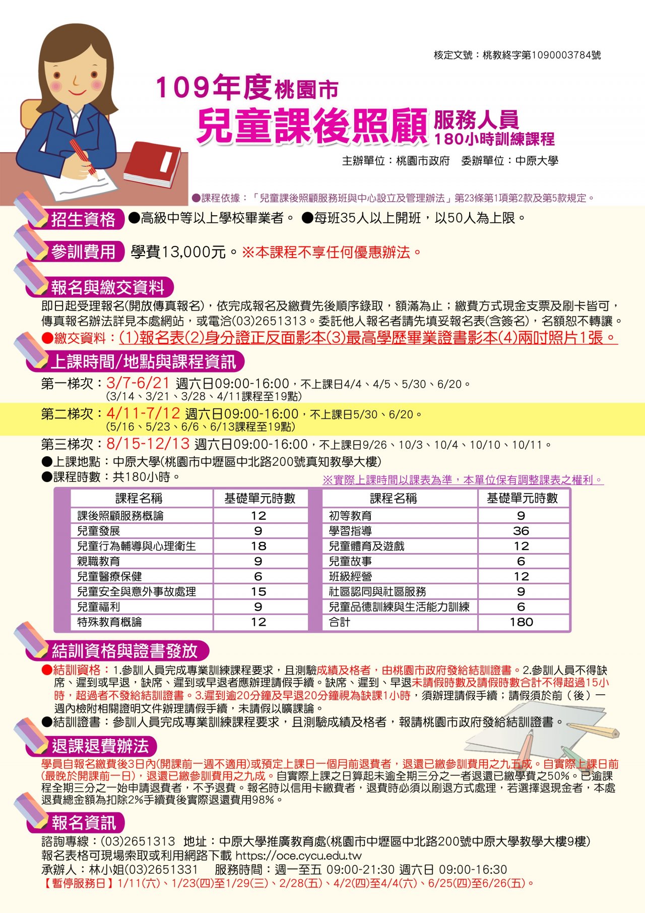 說明: 一、旨揭課程第二梯次(假日班):4月11日至7月12日;第三梯次(假日班):8月15日至12月13日。 二、課程簡章及報名表如附件,或至本校推廣教育處網站查閱下載,網址:https://bit.ly/2UhJdL4。 三、每班限額50名。 四、相關事宜請洽推廣教育處,電話:03-2651313。