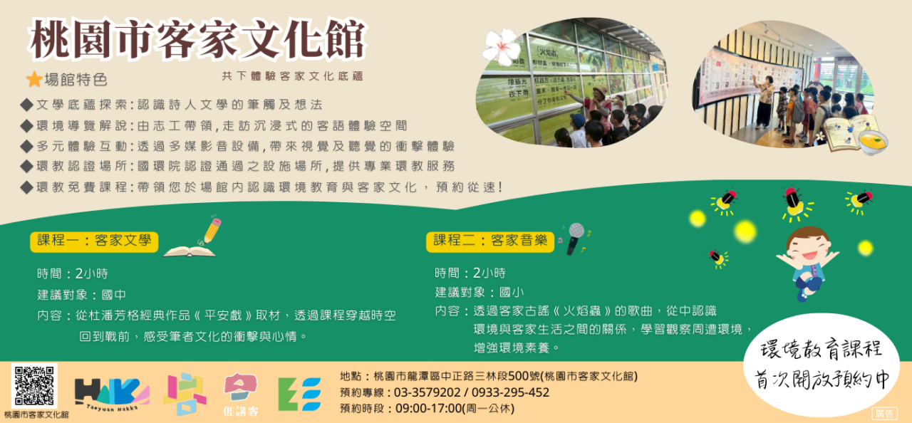 說明: 一、本局所轄桃園市客家文化館兼具客家文化展示與環境教育功能,為環境教育設施場所之一。透過多元展演、親子互動及文化體驗等方式推廣客家文化與環境教育。 二、本局環境教育課程有「客家文學」及「客家音樂」2套核定課程: (一)上課地點:桃園市龍潭區中正路三林段500號客家文化文化館。 (二)課程時長:2小時。 (三)課程均為免費,並採預約制辦理,請貴單位踴躍參與。 三、課程預約及相關訊息請洽新泰環境事業有限公司張先生,電話:(03)357-9202。