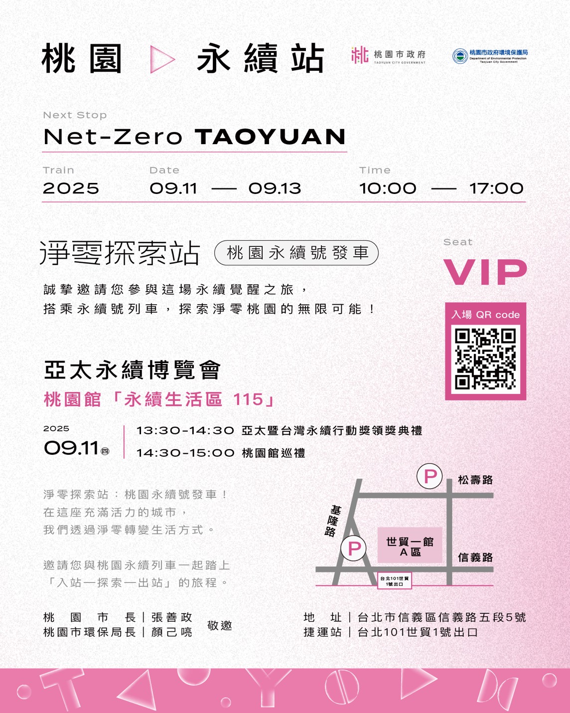 說明: 一、依據本府114年9月3日府環氣字第1140254025號函辦理。 二、旨揭博覽會資訊如下供參: (一)免費入場,預約報名參觀享抽獎資格,報名網址: https://www.accupass.com/event/2505220424009354151030 (二)活動詳情請見「亞太永續博覽會」官方網站: https://www.sdgs-asia.com.tw/ 三、檢附桃園館電子邀卡(可使用邀卡QR code入場)及亞太永續博覽會參觀報名文宣供參。