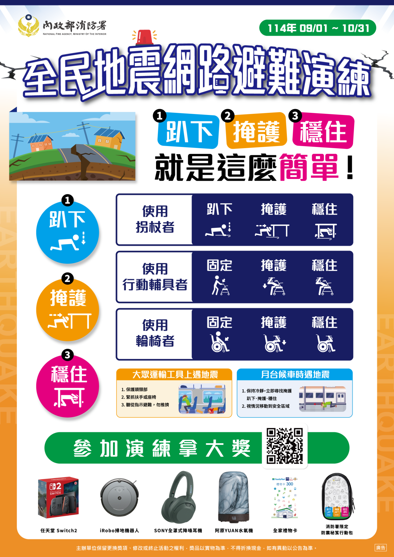 轉知內政部消防署「消防防災館」(https://reurl.cc/mY7g6A)國家防災日系列活動。