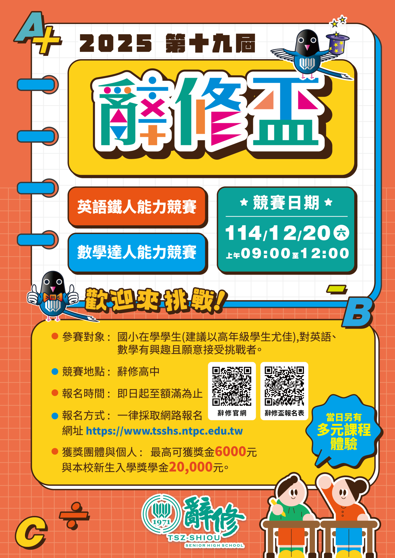| 二、 | 競賽日期為114年12月20日(星期六)上午9時,於本校大禮堂舉行。報名一律採網路受理,並自即日起至12月12日(星期五)13時截止。因參賽名額有限,至額滿為止(報名網址http://http://www.tsshs.ntpc.edu.tw,或掃瞄競賽辦法QR code),另錄取名單將以電子郵件、電話通知。 |
