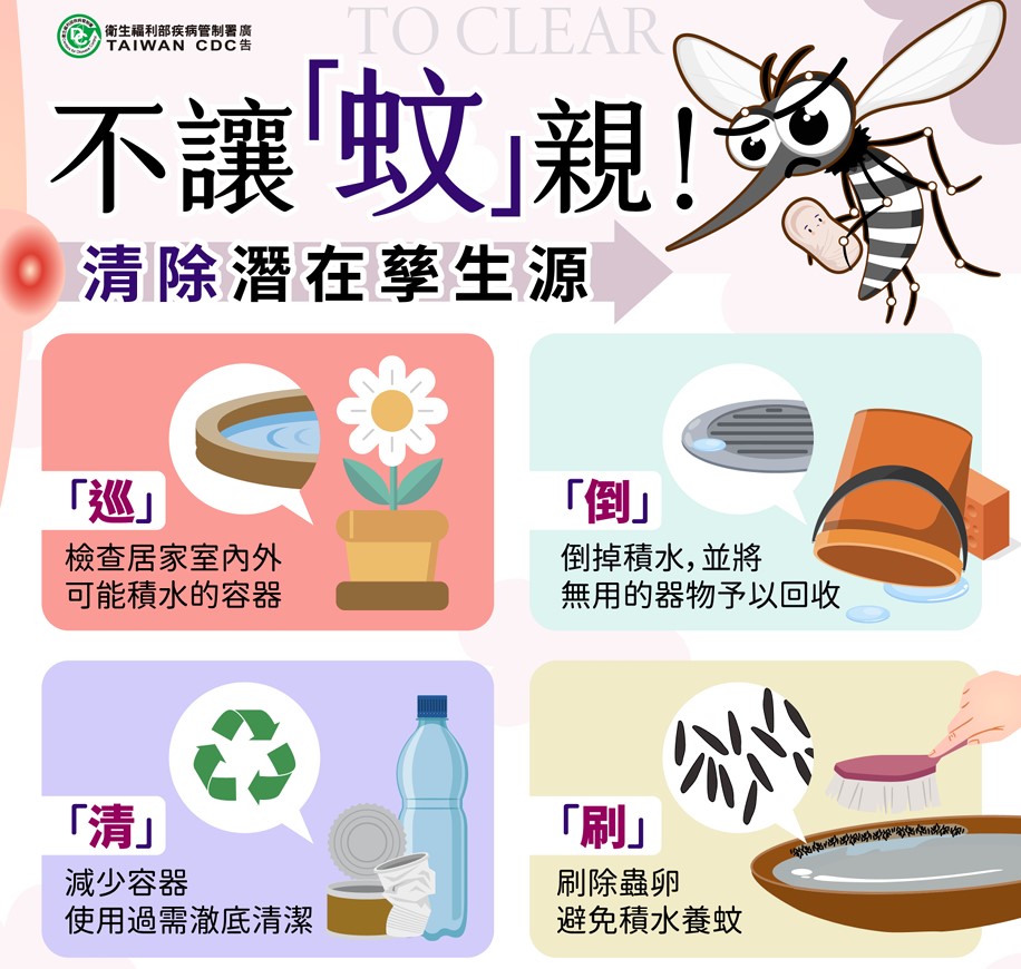 二、目前白天氣溫偏高,仍適合病媒蚊生長與活動,請澈底落實學校、住家內外環境整頓與積水容器「巡、倒、清、刷」,並於雨後加強巡檢,以降低病媒蚊密度,另請積極配合衛生單位進行相關防治工作。