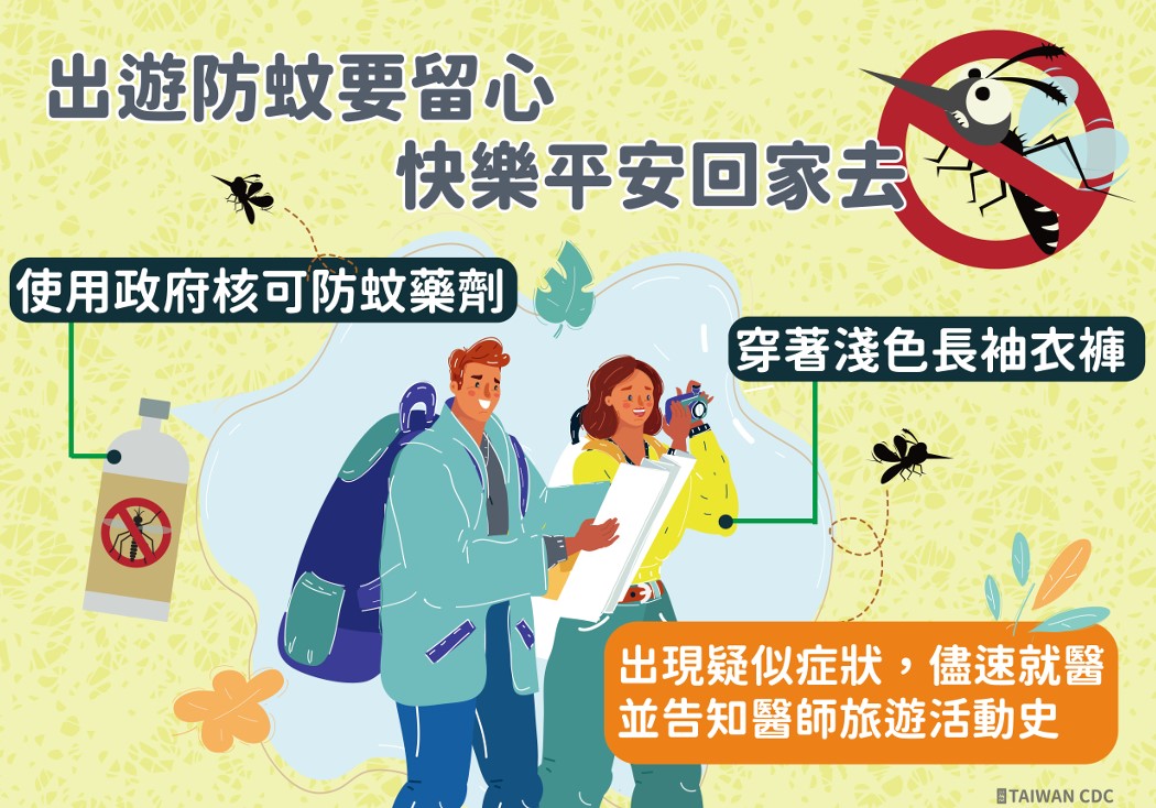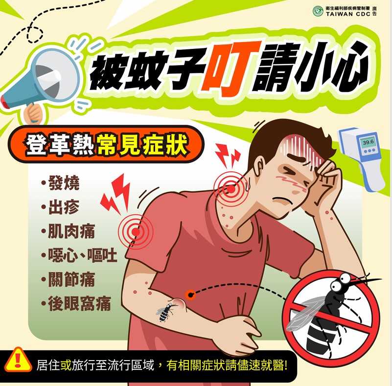 四、若發現有發燒、頭痛、後眼窩痛、肌肉關節痛、出疹等登革熱疑似症狀,應儘速就醫,並明確告知醫療院所旅遊活動史。