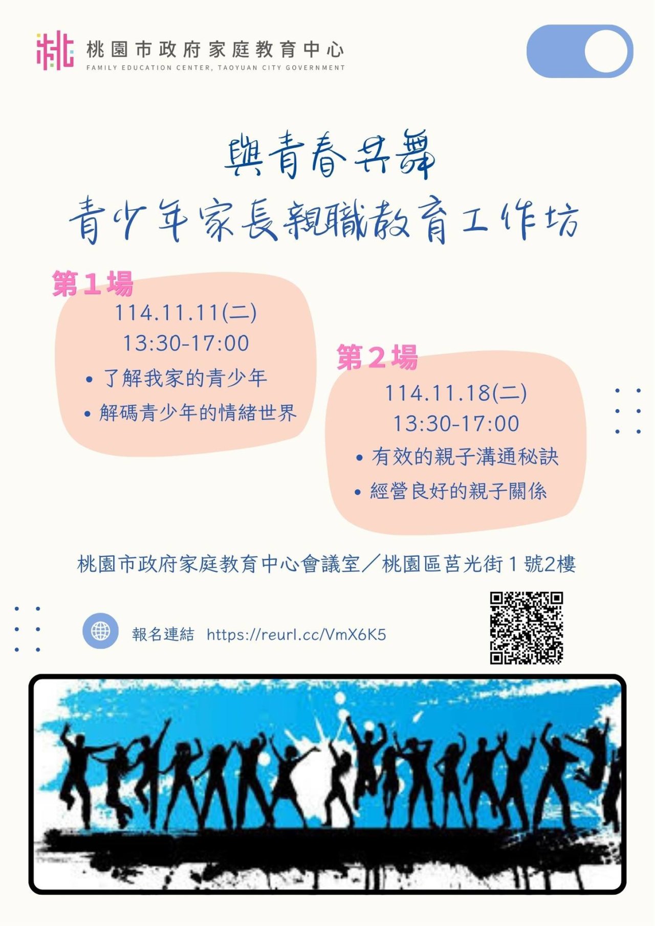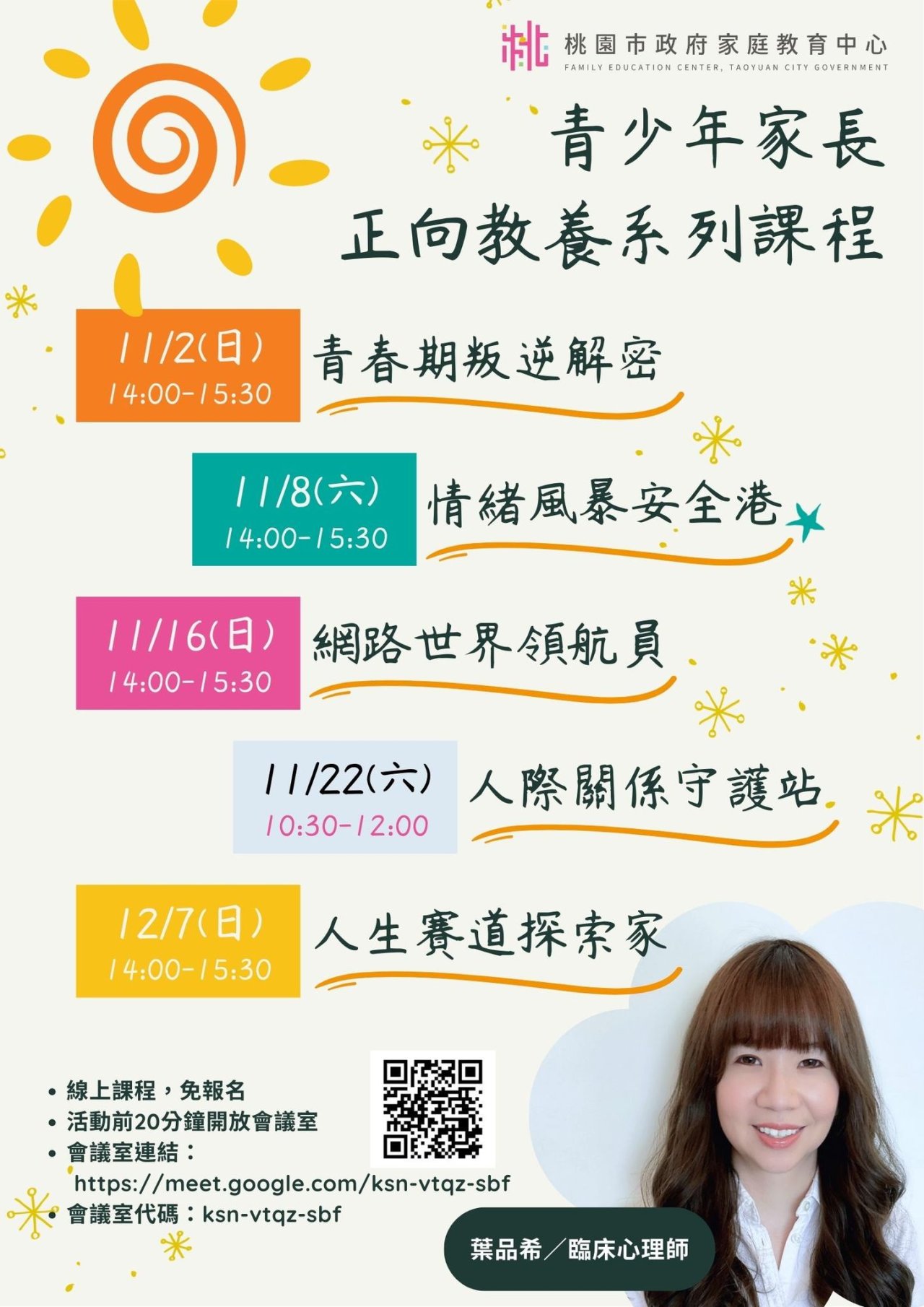 課程詳細資訊,請見中心課程行事曆( https://reurl.cc/xlGyGL )或追蹤「桃園市政府家庭教育中心」FB粉絲專頁;另倘有家庭教育個別化服務需求,可撥打4128185家庭教育諮詢專線,本市市民可申請小桃家線上諮詢室(預約連結: https://reurl.cc/oZWOY5 ),由中心媒合專業人員透過線上會議室提供服務。