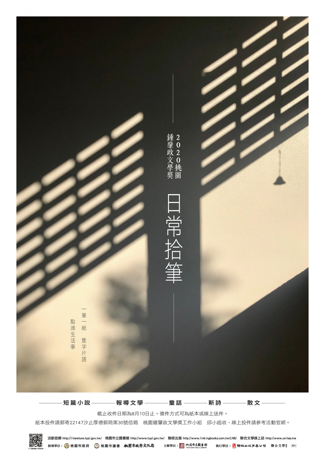 說明: 一、「2020桃園鍾肇政文學獎」徵件自即日起至109年8月10日截止,徵件類別為短篇小說、報導文學、散文、童話及新詩等5類組,總獎金新臺幣200萬元。 二、徵件資格:不限定國籍,不限定題材,惟須以繁體中文書寫。以未曾發表(含演出、網路、實體出版)、未曾獲獎之作品為限,翻譯、改寫作品不予受理。 三、投稿方式:採紙本或線上雙軌投稿方式,參賽者可自由選擇其中一種方式報名參賽,詳情請至桃園鍾肇政文學獎官方網站(http://literature.typl.gov.tw)瀏覽。