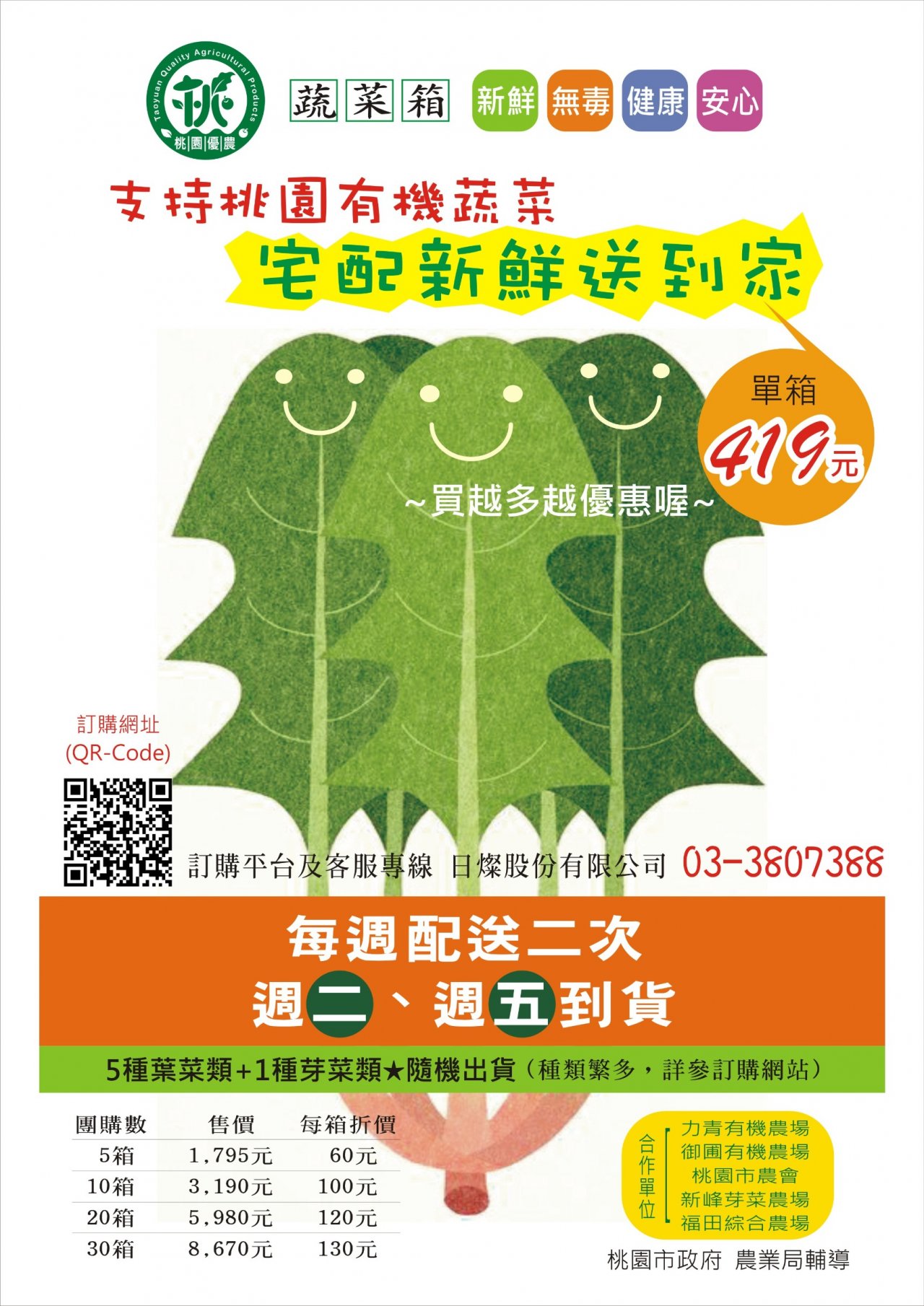 | 主旨: | 為推動在地優質有機蔬菜,特媒合本市有機平台業者、農會推出桃園優農蔬菜箱,歡迎踴躍訂購,請查照。 |