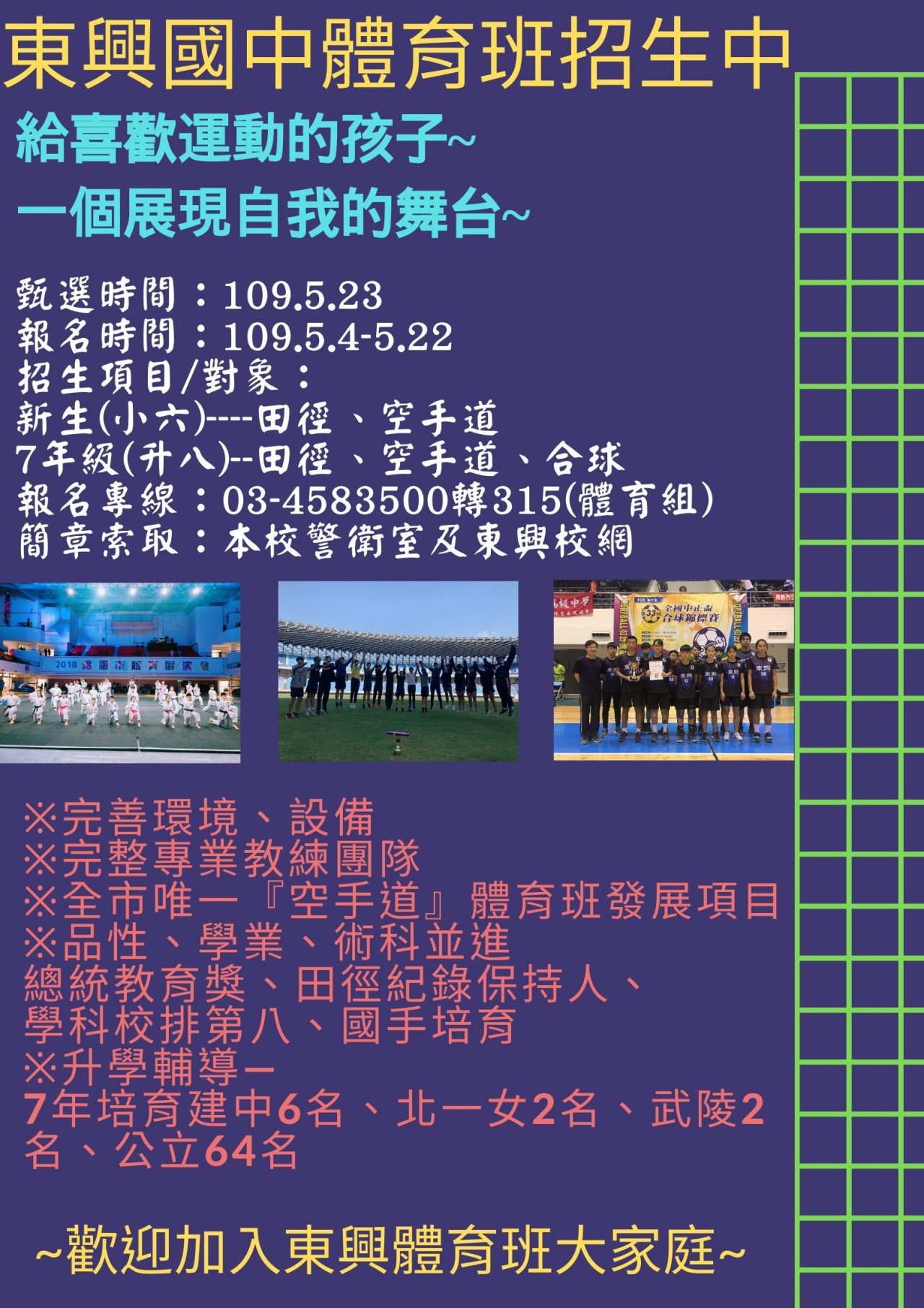 東興國中「109學年度體育班新生(含轉學.轉班生)入學第二次甄選簡章」