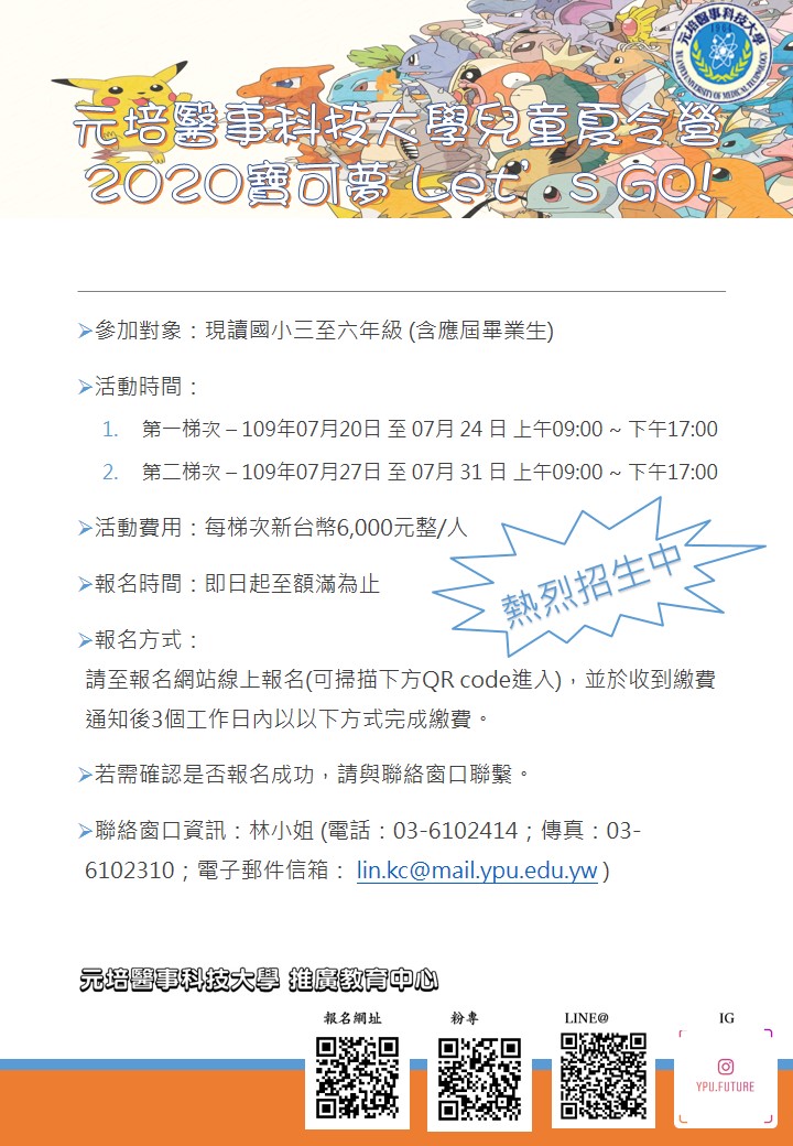 活動詳細資訊請參閱附件,或至該校招生推廣處推廣教育中心網站(https://future.ypu.edu.tw/)查閱